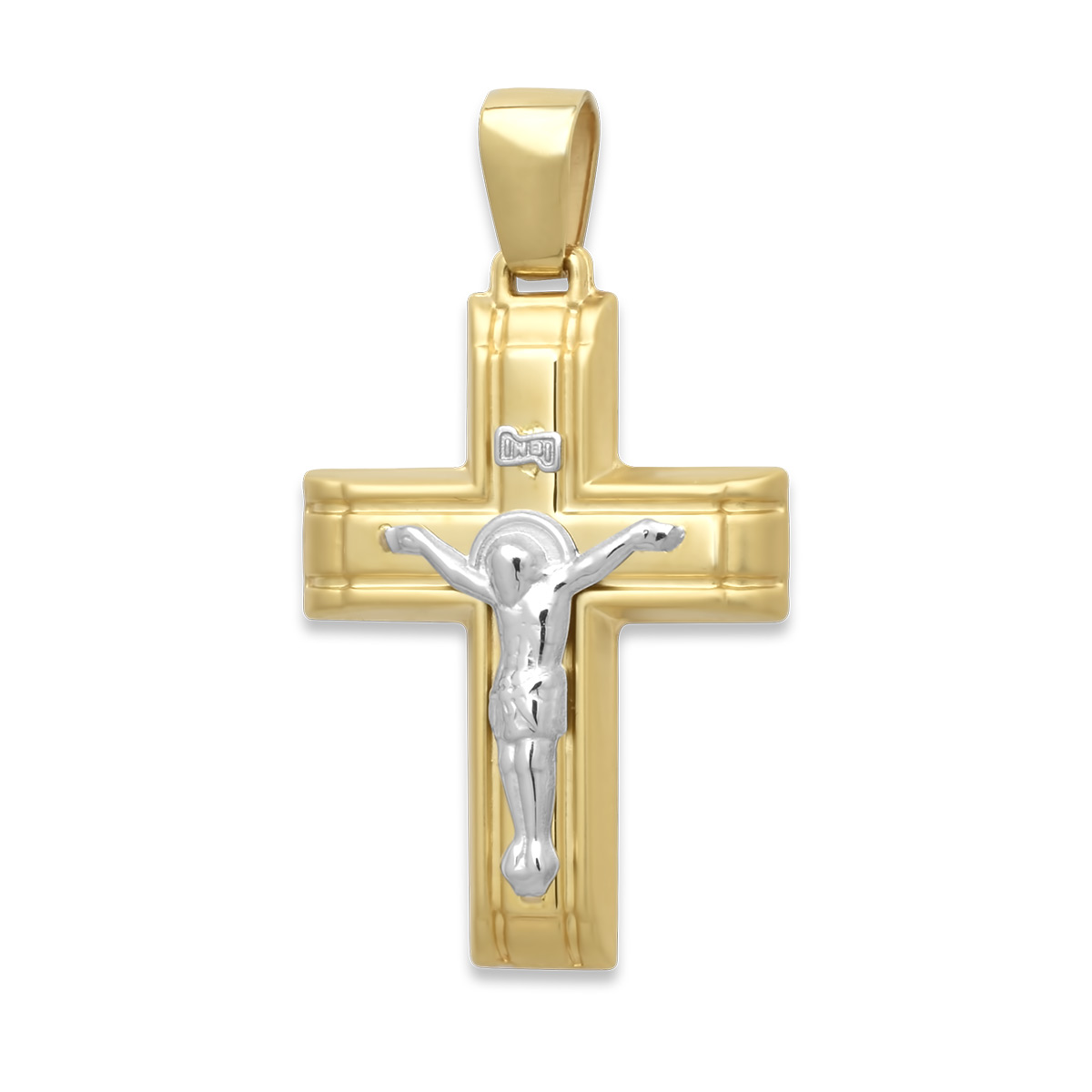 Δίχρωμος σταυρός Κ14 διπλής όψης με τον ΕσταυρωμένοΔίχρωμος σταυρός Κ14 διπλής όψης με τον Εσταυρωμένο