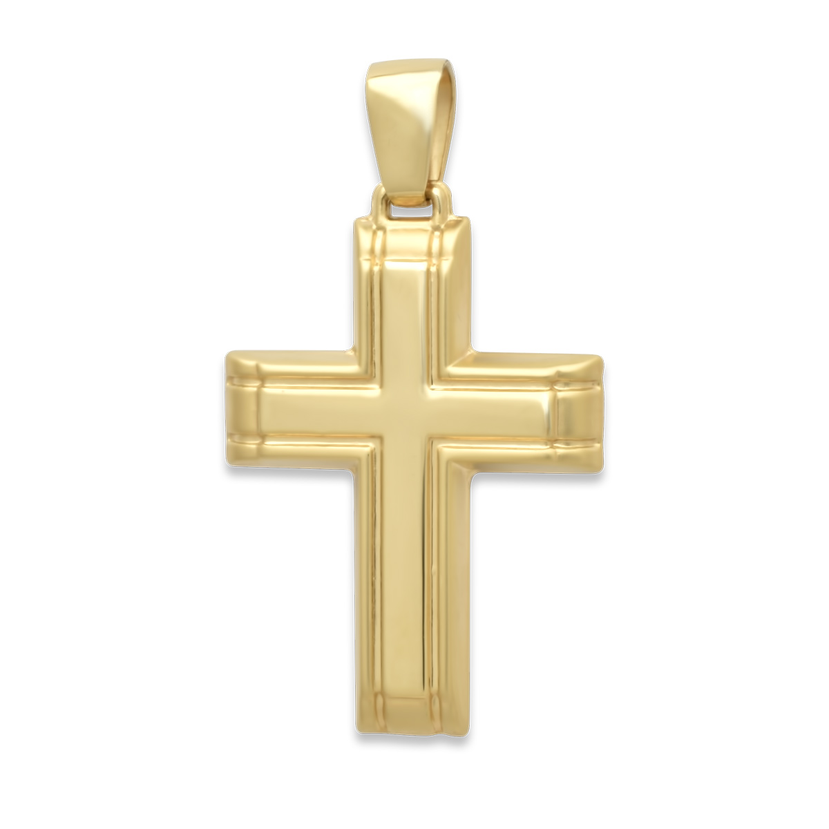 Ανδρικός σταυρός κατασκευασμένος από χρυσό και λευκόχρυσο 14 καρατίων με λουστρέ φινίρισμα. Ο σταυρός έχει δύο όψεις, η μία από αυτές είναι διακοσμημένη με τον Εσταυρωμένο στο κέντρο.